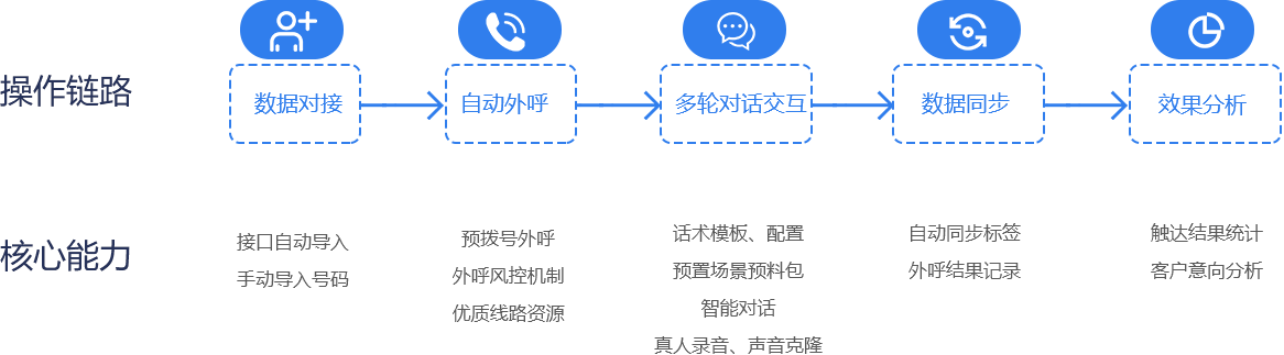 基于全宇智能AI外呼平台,利用平台核心能力,为项目从数据对接、自动外呼、多轮对话交互、数据同步到效果分析等提供完整的外呼操作链路方案。